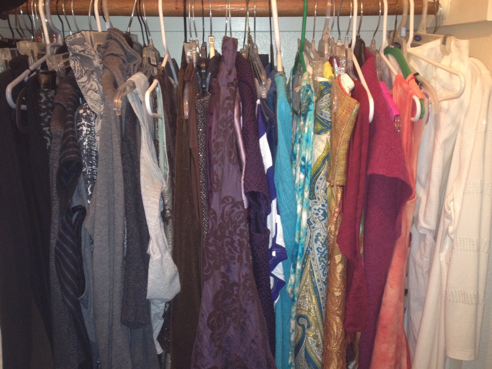 The way I’ve generally organized my closet in the past has been by type, i.e. skirts together, dresses together, etc. Here’s how my wardrobe (at least the parts that hang) looked using this plan: