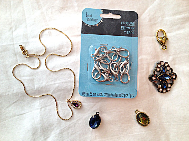 Possible make-your-own-zipper-pull materials, clockwise starting with the package of lobster-claw clasps: a fancier brass lobster-claw clasp, a jeweled pendant, faux peridot pendant, faux sapphire pendant, and an old necklace with a pendant that could be repurposed as a zipper-pull ornament.