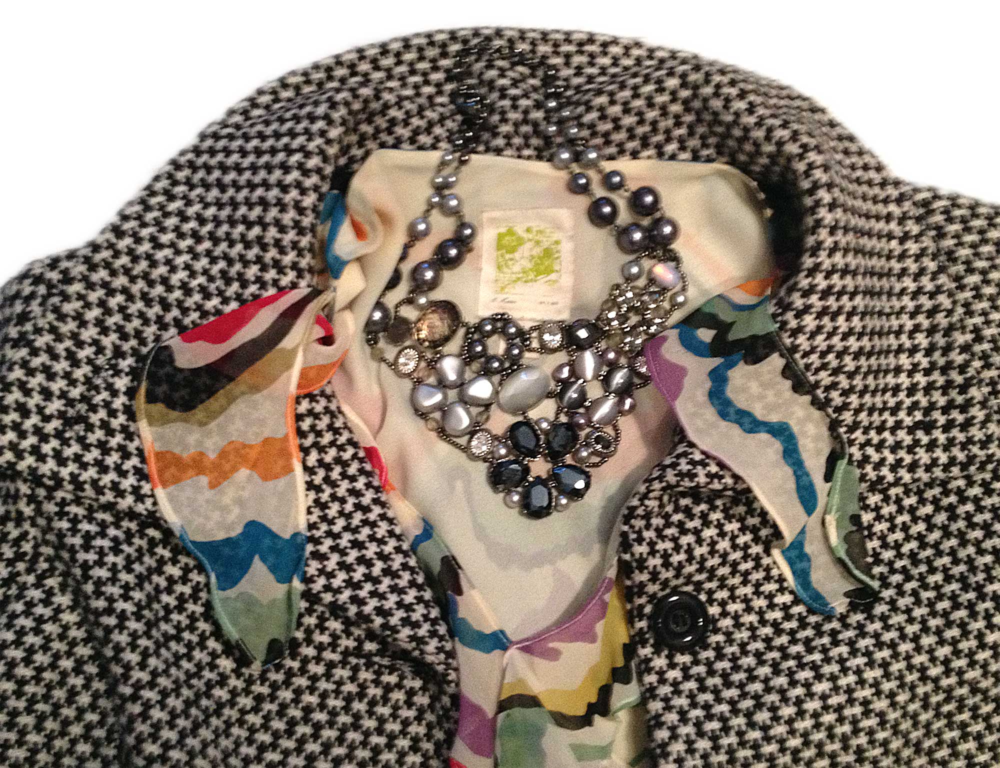 Step 2: Pick a coat. With the bits of black along with all the bright colors in the dress, a black coat seemed indicated. Oops. I don’t own a black coat, or for that matter, any coat of a color that would work. There was only one possibility: a lightweight black-and-white wool houndstooth coat. The coat itself could not be called anything but casual (I bought it for $15.00 at a thrift store, and most often wear it over jeans and sweaters), but the combination of houndstooth and brushstroke print create an appropriately artsy look.