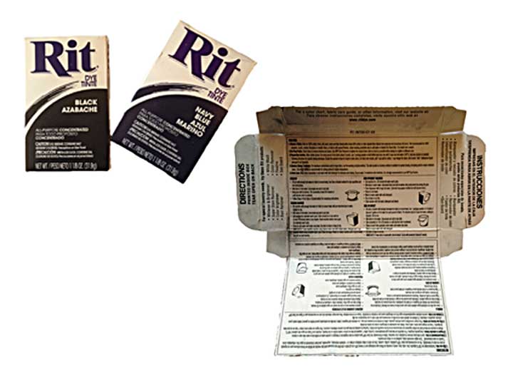 I wanted to get my jeans as dark as possible, but I thought that if I just used a dark blue on jeans that were already blue, I might only compound the original problem (i.e. end up with jeans that are darker blue, but still “dirty”). So I decided to use a combination of black and navy blue dyes, shown here with the instructions printed on the inside of the package: