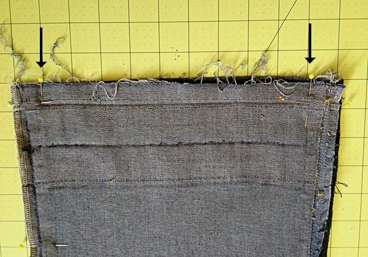 By laying my tape measure on the legs, more or less aligning with the gridline that goes vertically down from the pins, I can get a good visual impression of the difference my new seam will make.