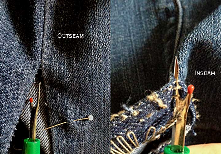 Ripping the seams: the outseam is a single row of stitching to undo; the inseam has 3!