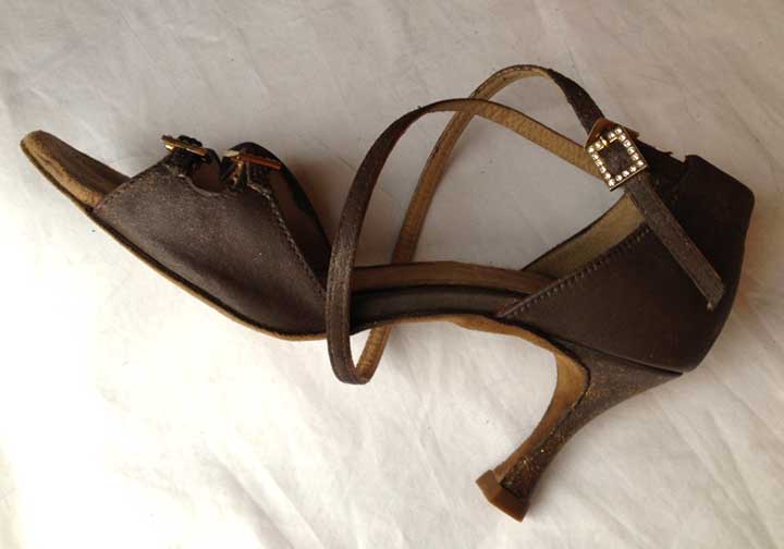 Once I had my materials, I was ready to start the color mixing, but I also thought I should test the colors first, just not on the makeover-bound shoes. It occurred to me that I still had some very old ballroom shoes, completely worn to a frazzle, but which could possibly contribute to this project before being given a decent burial. Here’s what one of these poor things looked like before my color test: