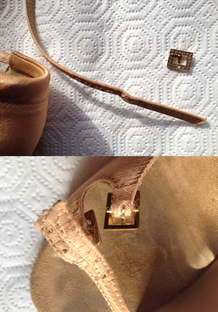 My final preparatory step was to unfasten the 2 little buckles on each instep, and to remove the long strap; this strap pulls completely out of the casing at the back of the heel, once the buckle is removed: