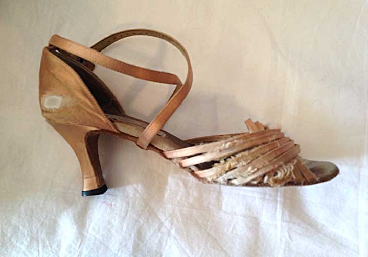 Dance shoes, pre-makeover: The classic ballroom gold satin is pretty, but it’s time for a change!