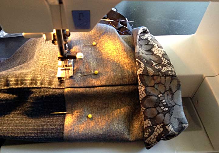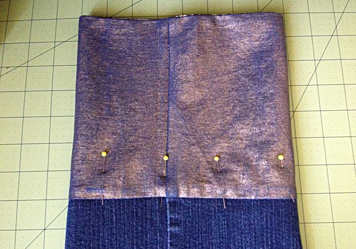 Here we go. In the photo below, after finishing Step 1, I’ve pinned my new cuffs to the lower edge of the bronze band prior to stitching. Make sure the right sides of both pieces are facing each other; what you’re seeing in this photo is the wrong side of the lace-print fabric, so the right side is against the right side of the jeans.