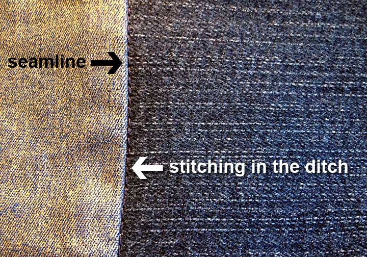 Tip: If you’re not familiar with the stitch-in-the-ditch concept, it just means that your stitching line will be as close to an existing seamline as possible, without stitching at all on the fold created by pressing that seam after stitching. Here’s a look: