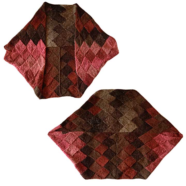 Entrelac, from a French word meaning “to interlace”, is the name of the knitting technique I’ve used to make this scarf. It involves knitting one block at a time, rather than back and forth all the way across in rows, and is actually much easier to do than it looks. If you’re interested in learning this fascinating (and addictive to knit) technique, I have a pattern in my Etsy shop you might consider; the pattern is for a pillow cover (a great small project to introduce you to entrelac), and includes full instructions for the entrelac technique, as well as for two pillow sizes.