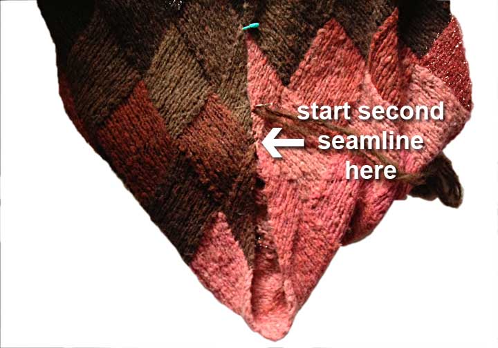 Step 2: Sew your Cocoon together. You can decide what seaming technique to use; it will depend on the style of scarf you’re using. In my case, I’m using my favorite seaming style, mattress stitch, which is worked from the right side (important here since I want to match up the diamonds) and produces an invisible seam. (Click here for a mattress-stitch tutorial.)