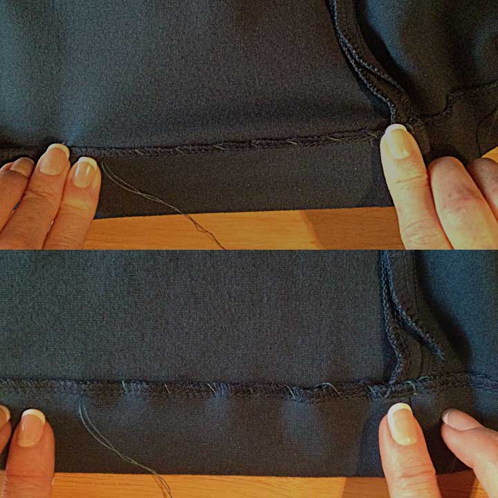 The stretch test: Every 5 stitches or so, I’m giving my new hem a little stretch to make sure I’m not stitching too tightly to allow some give. In the bottom photo, after I let the fabric relax, you can see that there’s breathing room now between the stitches. (Don’t overdo this, though; you only need a little give.)