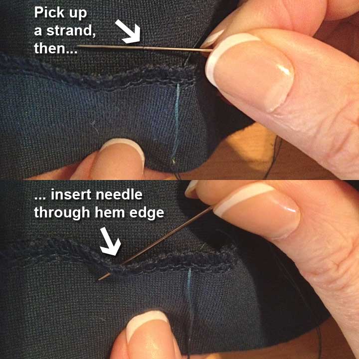 Tip: The reason for only picking up a single strand in the first step is to make your hem as close to invisible as it can be on the right side of your garment. There are some fabrics on which almost everything will show (silk charmeuse comes to mind), so it’s possible that this technique will not be ideal for your garment.
