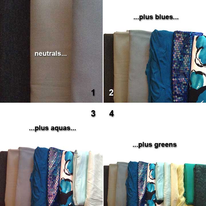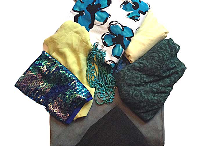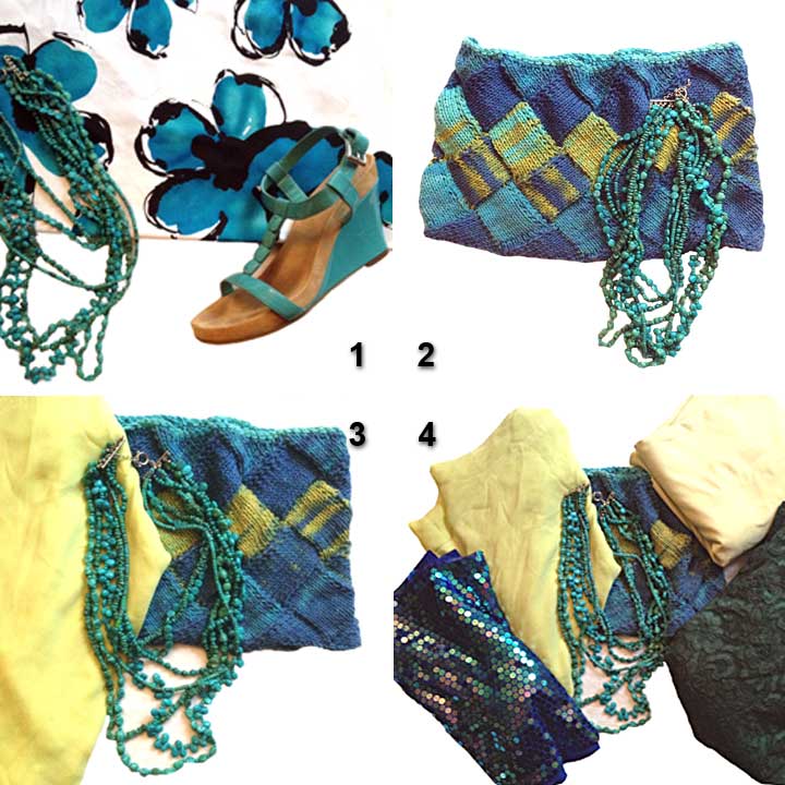 Photo details: 1. Because I really do want to use as many things as possible that I already have, I usually start my travel wardrobes with accessories. Here, my favorite turquoise necklace and a wedge sandal (both from my Santa Fe Wardrobe) blend nicely with my cotton print. But I don’t want a wardrobe with nothing but turquoise (at least not this time). 2. Looking through anything turquoise, I found this cowl I knitted from cotton yarn; I’m loving the addition of the chartreuse with all the shades of turquoise, aqua, and teal. 3. From my fabric stash comes this gorgeous chartreuse silk georgette. 4. Digging further into my fabrics yields (clockwise from far left) iridescent sequins (stretch), chartreuse georgette, citron rayon/spandex knit, and dark green stretch lace.