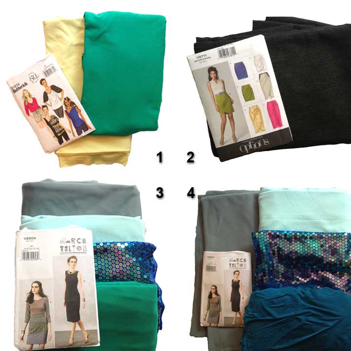 Fabrics and patterns: potential pairings. 1. Asymmetrical top (Butterick 5856), lower left version. 2. Tulip skirt (Vogue 8711), longer version. 3 & 4. Dress with overlapping tiers (Vogue 8904), longer version, shown with 2 possible fabric groupings.
