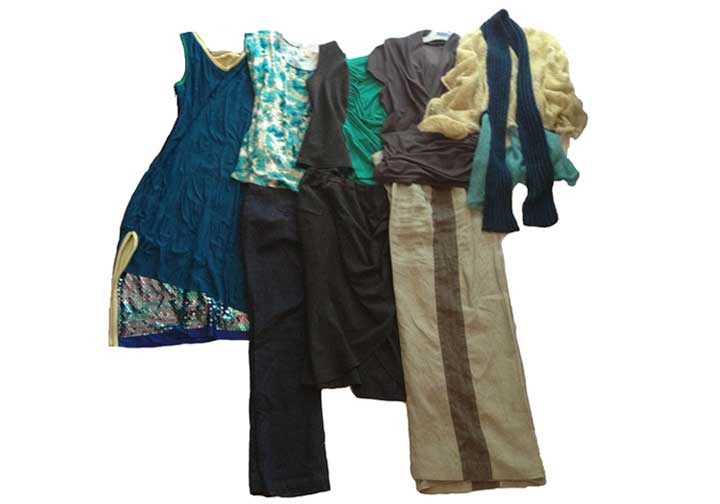 ORD wardrobe. Clockwise from left: dress, print knit top, emerald/charcoal knit top, charcoal knit top, kimono sweater, linen trousers, charcoal knit skirt, jeans. (Of these, I made all but the print top and jeans!)