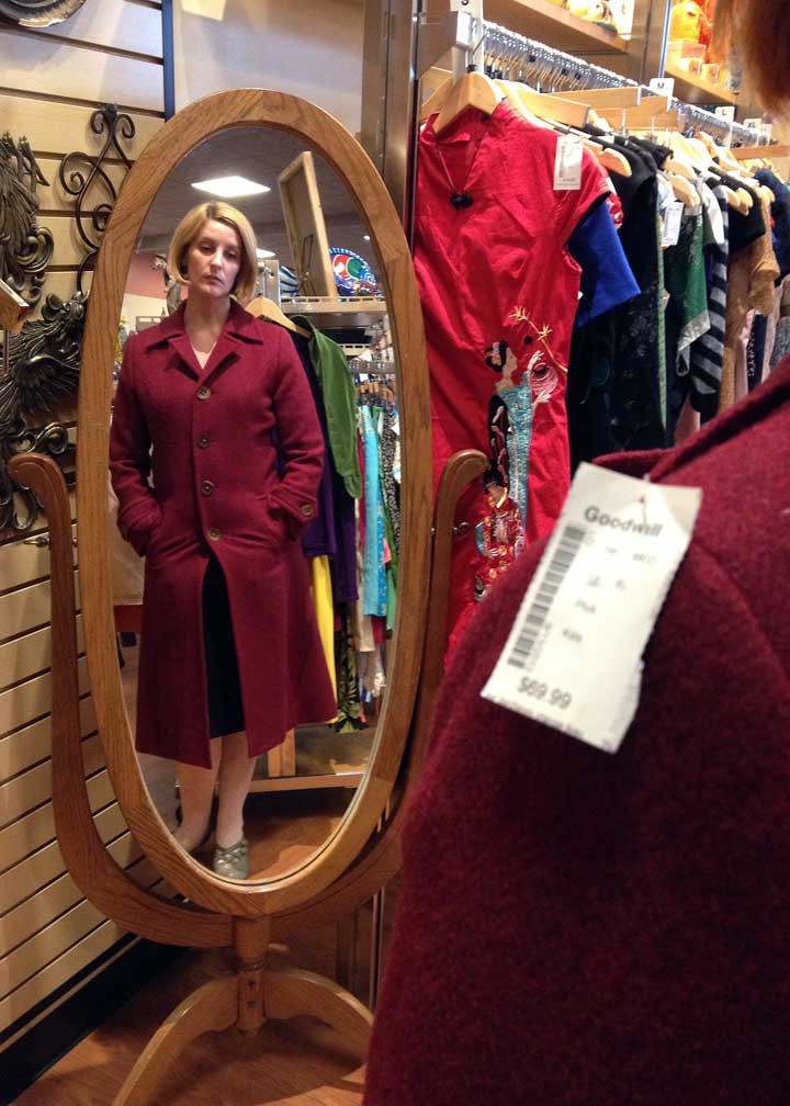 Winter coat in a luscious shade of subtly-tweedy raspberry wool. It’s in amazing condition, with equally amazing details (see additional photos below), will likely last for years, and the price was $69.99! If this was for me, I’d shorten it by about 8″, but Valerie prefers this classic mid-calf length. (By the way, she actually loves this coat; she just doesn’t like having her picture taken.) This mirror was conveniently placed just outside the dressing rooms.