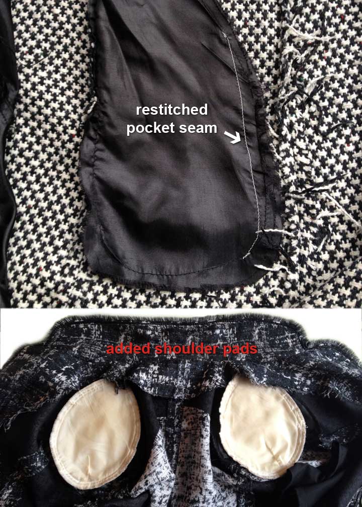 Pre-lining chores. Top: the pocket, made from lining fabric, started raveling, resulting in a good-sized hole, so I restitched it (I used white thread so you could see the new stitching, since it wouldn’t show on the outside). Bottom: I hand-tacked substantial shoulder pads into the top part, partly to create a nicer shape, but also to help support the extra weight added by the second jacket on the bottom.
