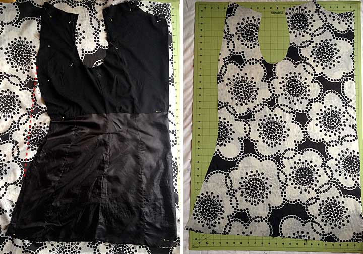 New lining fabric! (This is a double layer of a lightweight fabric, so you can see a bit of the design showing through from the layer underneath.) $6.99/yd., by the way, and because of its surprising 62″ width, and the fact that I wasn’t making new sleeves, it only took 1 yard!