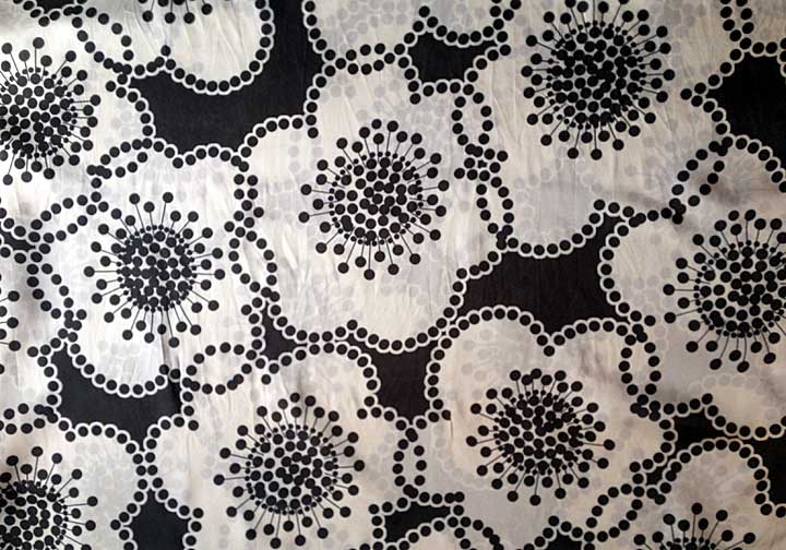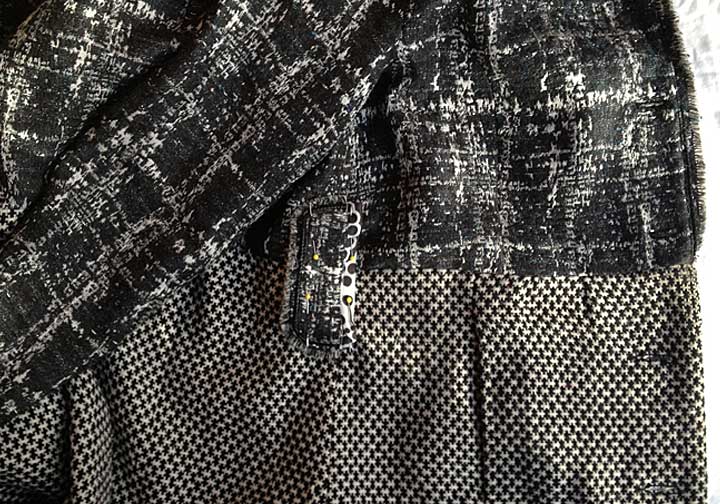I really liked the idea of putting in a printed lining, hopefully something black-and-white, bold, and graphic. Much to my surprise, I actually found this with the other linings: it’s acetate (commonly used for ready-to-wear linings, not my favorite, but I can live with it), an amazing 62″ wide, and look at this print!