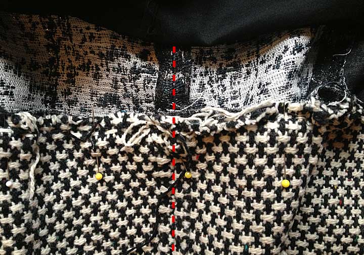 Matching seams for even spacing. Here, the dotted red line shows where I’ve matched the side seams of the 2 jackets while pinning the waist seam together.