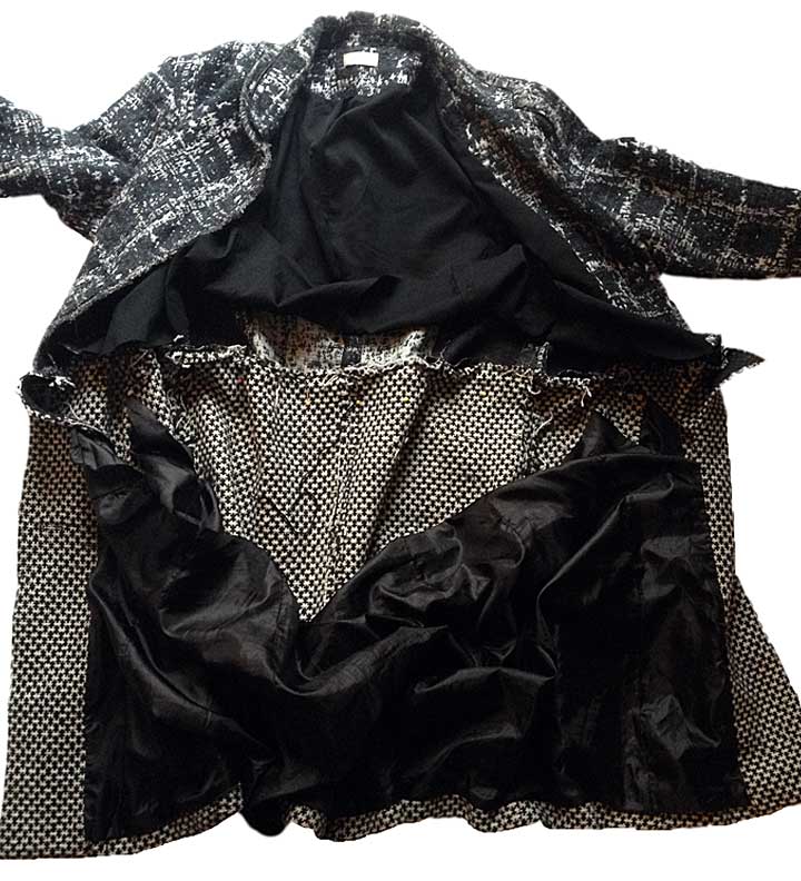 *Yes, I know that sounds like more work, but in the long run, I think it will be worth it. For one thing, even though both original linings are black, the plaid jacket’s lining is silk, and the other’s is acetate, so they look and feel different; I know I’m cobbling together the outer parts, but I don’t like doing that with the linings too in this case. I’ll have the opportunity to use a fun new lining fabric (wait ’til you see what I found!), and I’m only replacing the body lining, not the sleeves, which simplifies the process. Also, I can use the existing lining parts as patterns for the new lining, so it’s not like I’ll have to draft a custom pattern. I like this idea!