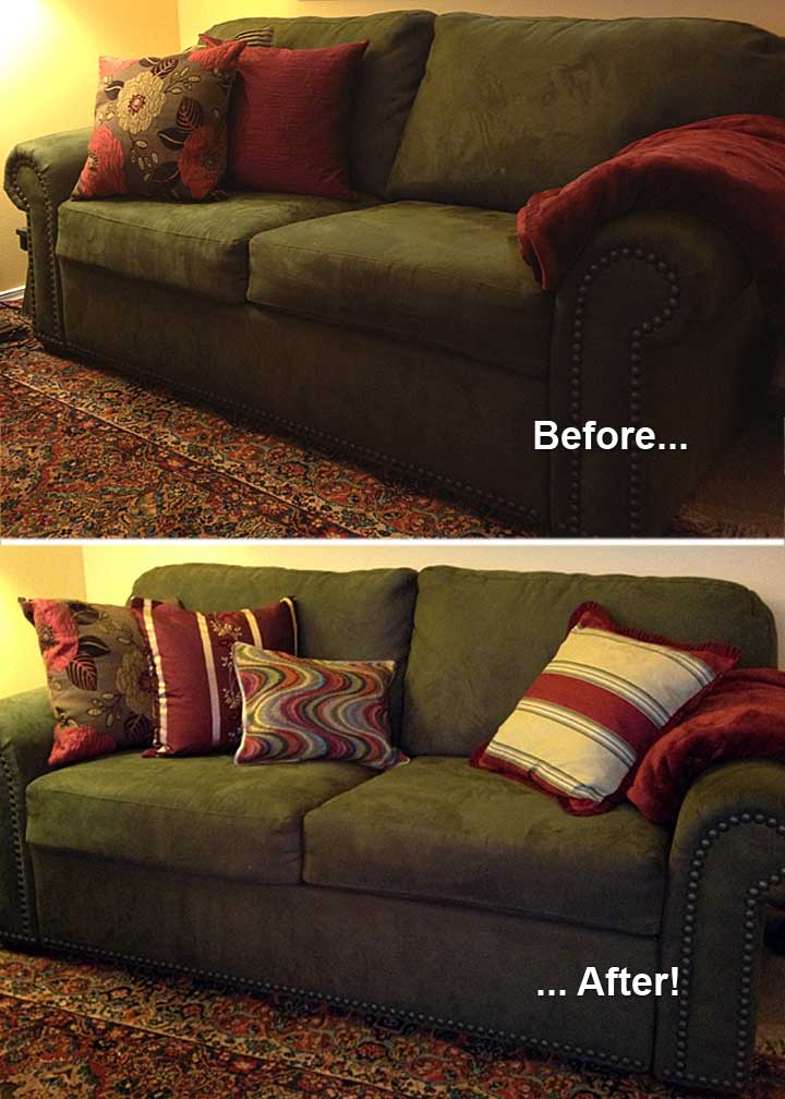Why change the pillows? Well, that’s what I asked Mom: what was the actual issue with the existing pillows? Wrong colors, sizes, shapes? For her, it was a combination of wrong colors and too much of them, i.e. solid-color pillows creating large blocks of colors, as in this “before” picture: