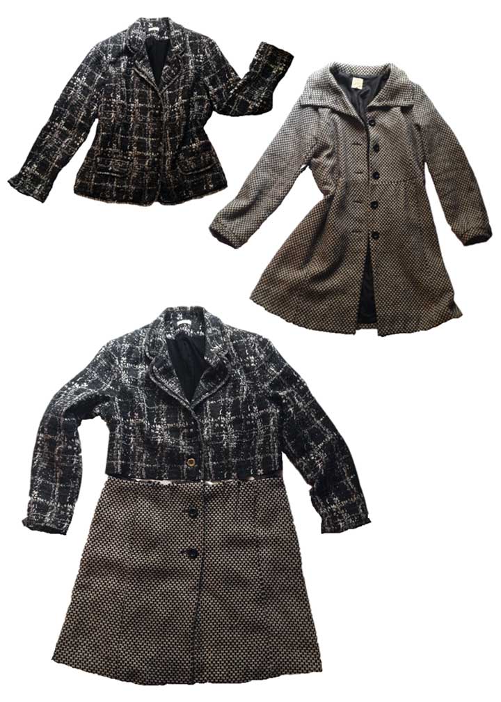 My black-and-white thrift-shop jackets, before entering the CYC lab. 1. Wool/cotton/rayon blend tweed/windowpane plaid jacket, lined. Thrift-shop price: $9.95.2. Wool/polyester blend bird’s-eye tweed coat, lined. Thrift-shop price: $14.95.